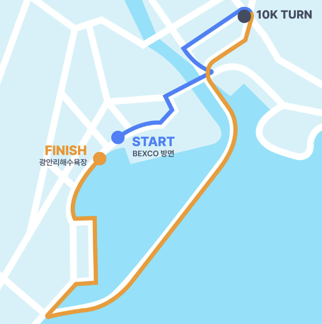 10km 나이트레이스 코스광안리해수욕장을 출발점으로 하여 광안대교의 아름다운 야경을 배경으로 펼쳐지는 특별한 코스입니다. 서울 여의도 행사와는 완전히 다른 매력으로, 부산의 상징적인 야경과 함께 달리는 경험을 제공합니다.